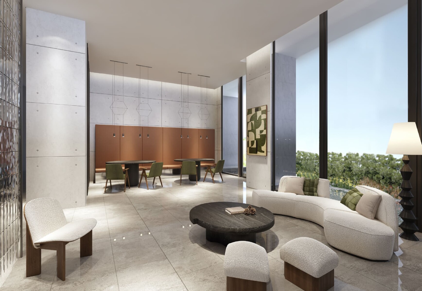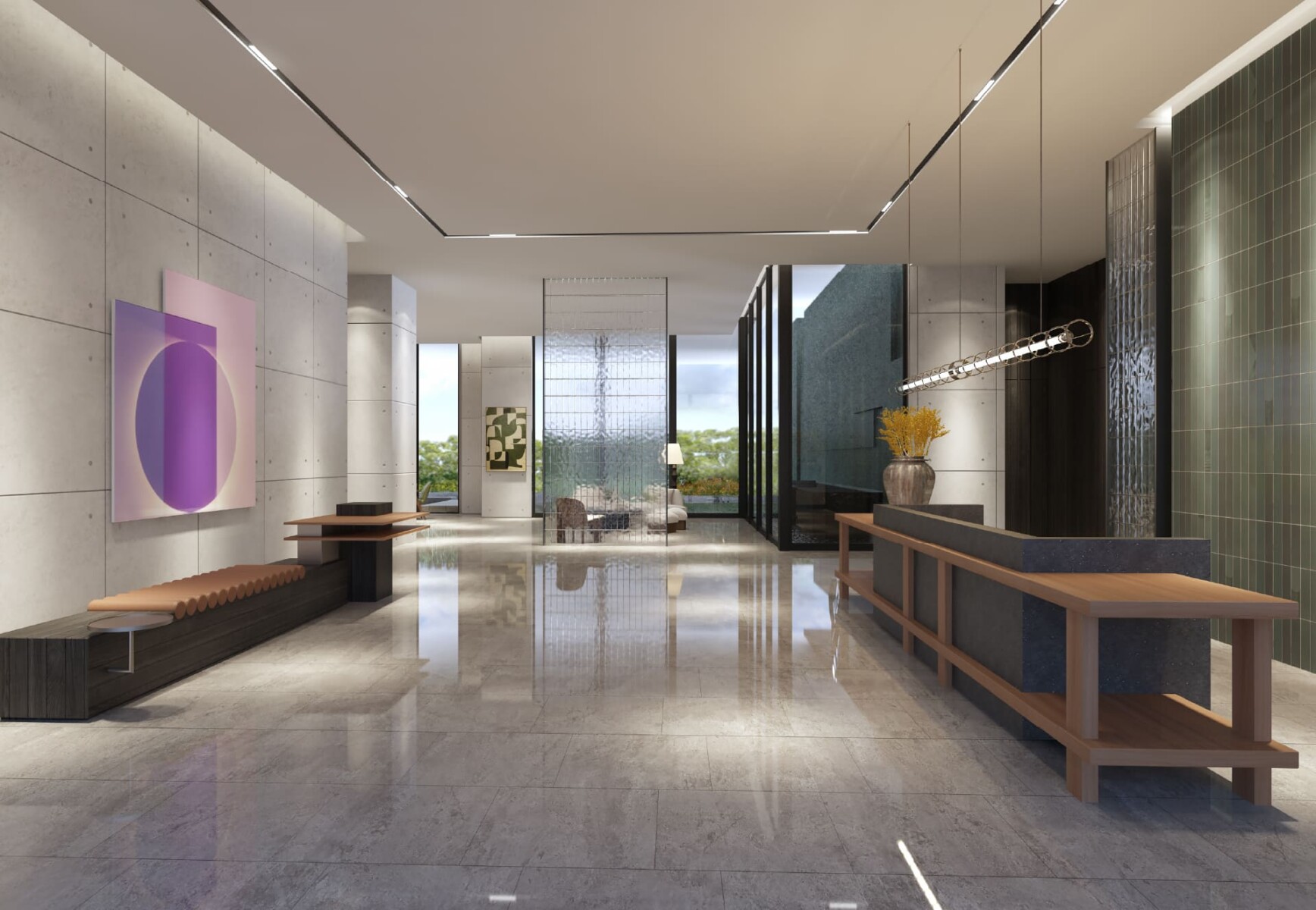 現代設計的開放大廳,搭配幾何裝飾點缀,光影在空間中舞動,流露出沉穩而優雅的韻律。
